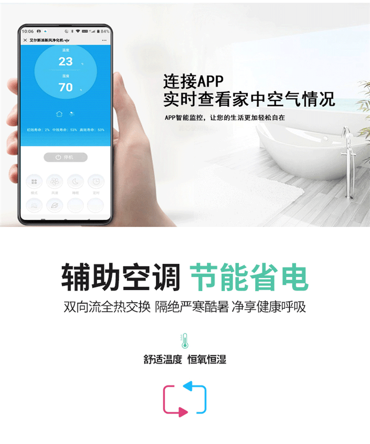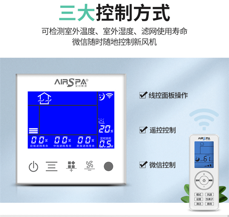 2、超大液晶顯示:自動顯示功能模式、風量大小、室內溫度、濕度、空氣質量、二氧化碳濃度、負離子。高貴、典雅