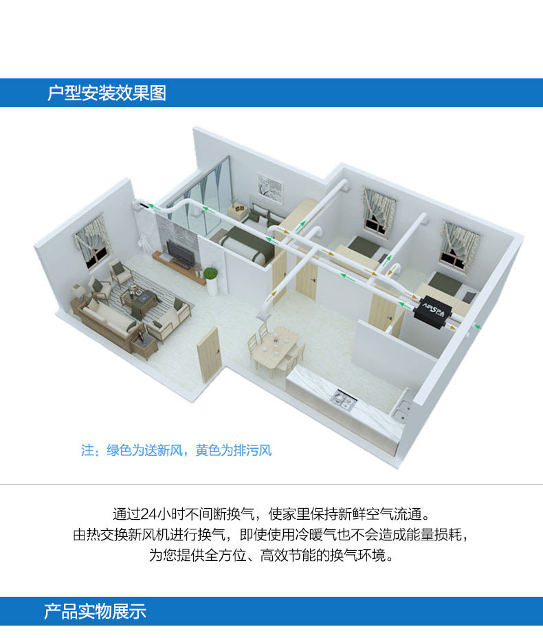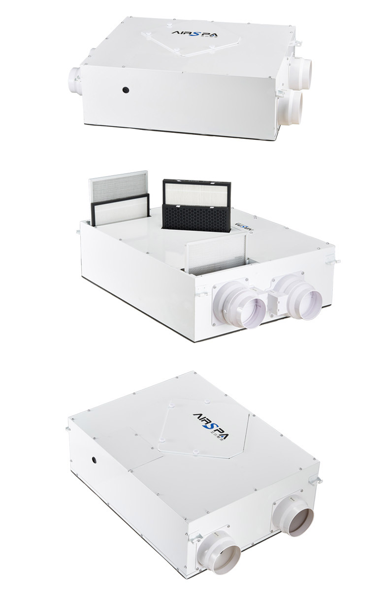 高能效比:采用水平進排風,具非常高的能效比,可回收70%以上能量 高效過濾:采用歐洲標準H13級過濾,多重過濾;PM2.5過濾99%以上 雙向流新風機:訂機采用雙核動力設計,動力強,體積小;采用直流無刷電機,低噪音,低能耗